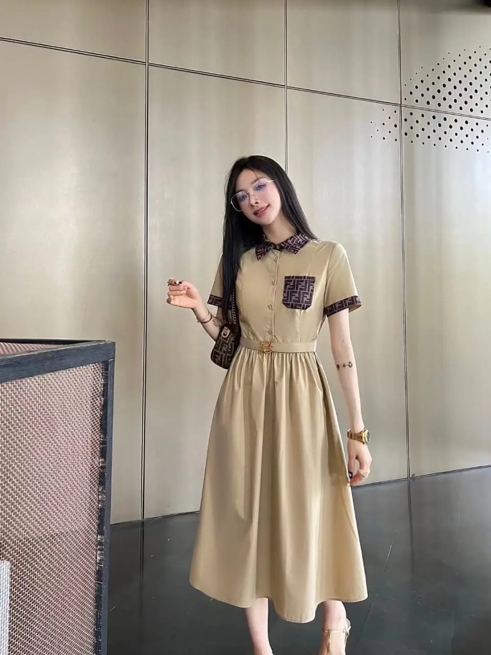 The defining features begin with a precise pointed collar and a sleek button-down placket, creating a sharp, polished foundation. The short sleeves are perfectly tailored for a clean finish, while the subtle A-line skirt provides an elegant drape that flatters the silhouette. Every stitch, seam, and button reflects FENDI’s unwavering commitment to master quality, ensuring a garment of exceptional durability and finesse.