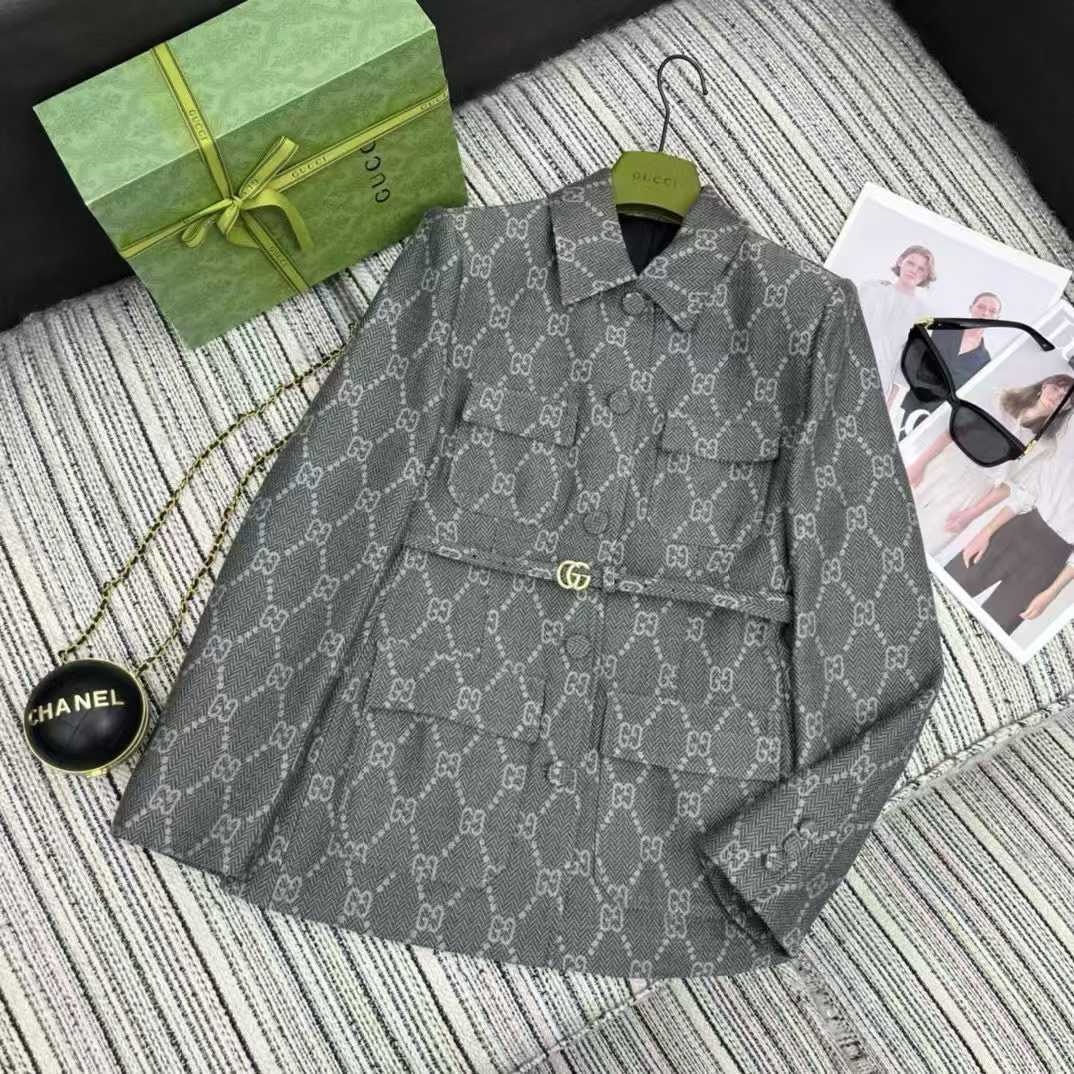 The jacket is constructed from premium, mid-weight denim that offers a comfortable, broken-in feel from the first wear. The iconic interlocking GG motif is masterfully woven throughout the fabric, creating a bold and unmistakable statement of high fashion. Every detail, from the precision of the stitching to the rich, tonal contrast of the pattern, reflects an unwavering commitment to quality.
