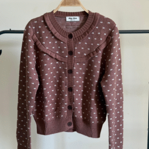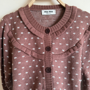 Embrace the playful yet sophisticated charm of Miu Miu with this exquisite Miu Miu Dotted Knit Cardigan. Meticulously crafted to “super master” quality standards, this piece is a testament to luxurious craftsmanship and avant-garde design. The sumptuous knit fabric offers a soft, cozy embrace, making it an irresistible layering essential.