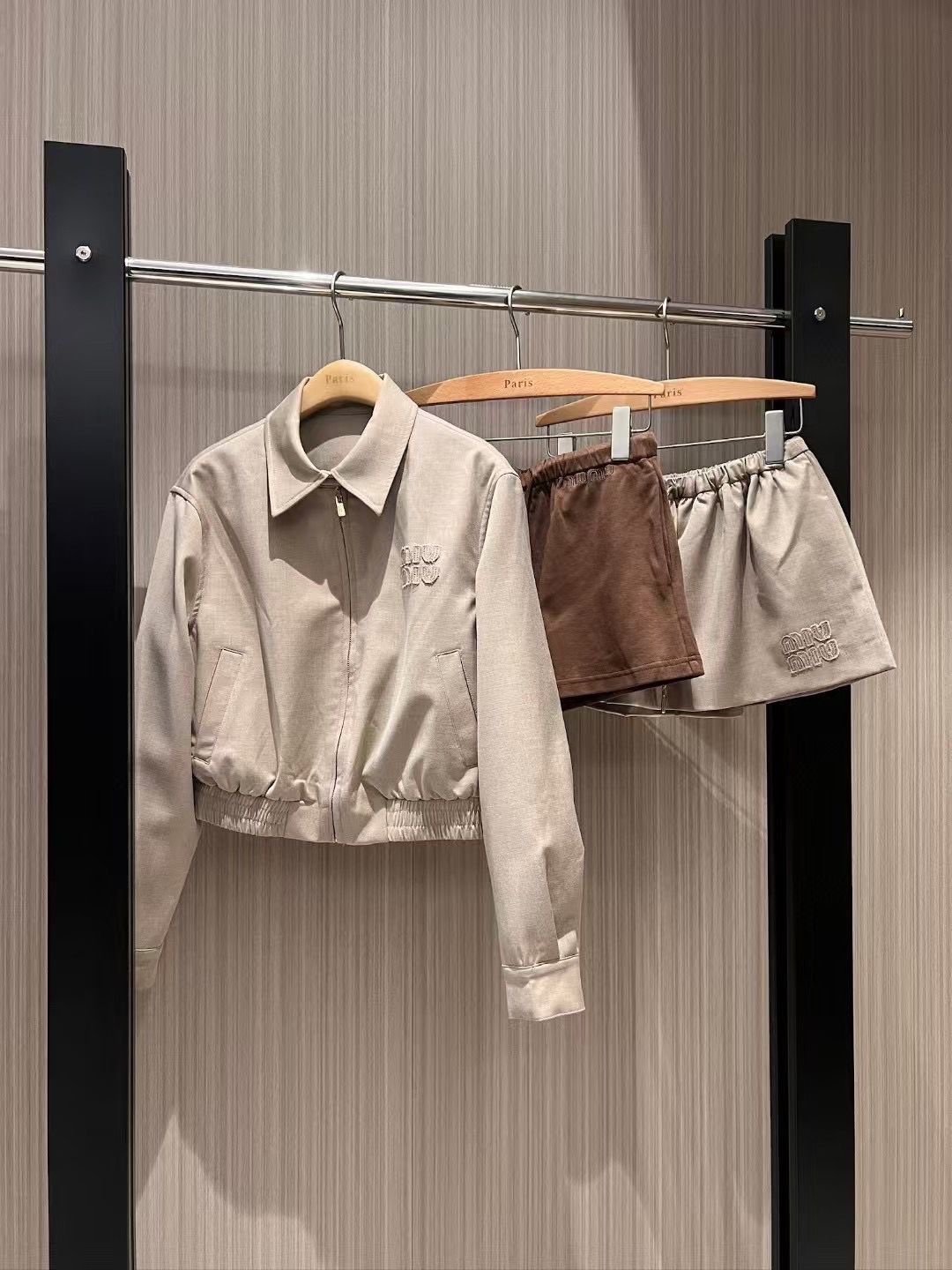 The set features a chic, high-waisted skirt with a subtle elasticated waistband, ensuring a flawless and forgiving fit. Paired perfectly is the cropped, sharp-shouldered jacket, creating a silhouette that is both polished and contemporary. Defined by clean lines and minimalist MIU MIU branding, this ensemble is a masterclass in versatile dressing.
