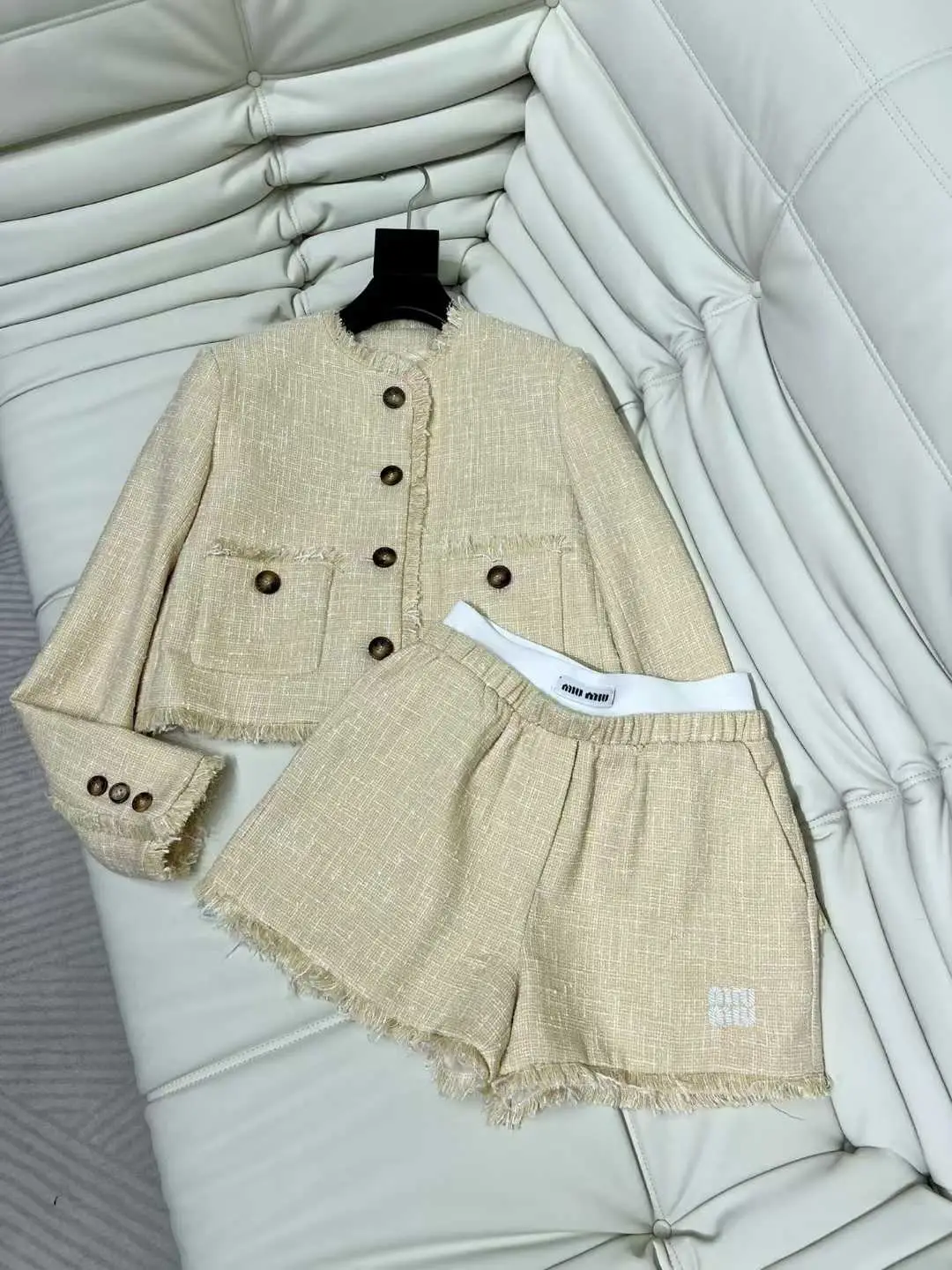 Embody timeless sophistication with the MIU MIU Fitted Tweed Waistcoat, a piece that epitomizes luxury craftsmanship. Meticulously constructed from our signature super master quality bouclé tweed, this waistcoat offers a richly textured feel and exceptional durability. The sharply tailored, fitted silhouette accentuates the waist, creating a flattering and powerful line.
