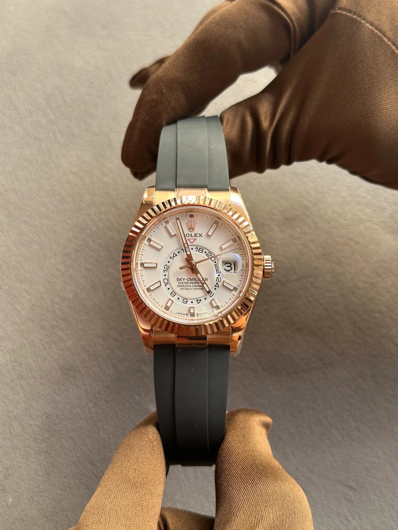 Rolex Sky-Dweller Rose Gold White Dial Oysterflex – copywatchesdubai.com