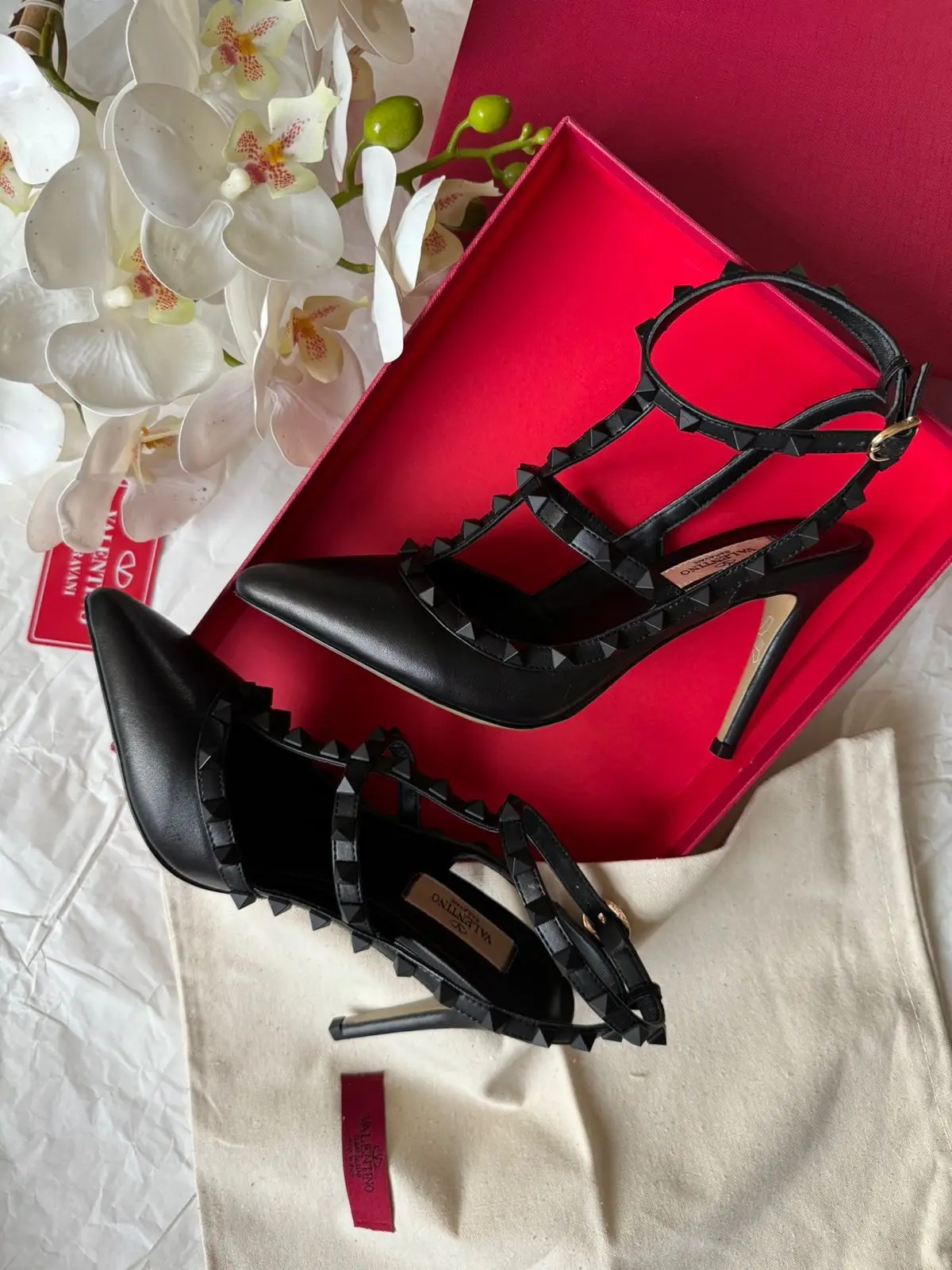 Crafted in Italy from the finest supple leather, the shoe contours to your foot for an exquisite, custom fit. The elegantly sculpted toe and flattering heel height elongate the leg, creating a posture of pure confidence. The signature Rockstuds are meticulously placed along a slender ankle strap and a flattering V-shaped vamp, framing the foot with a bold, architectural statement.