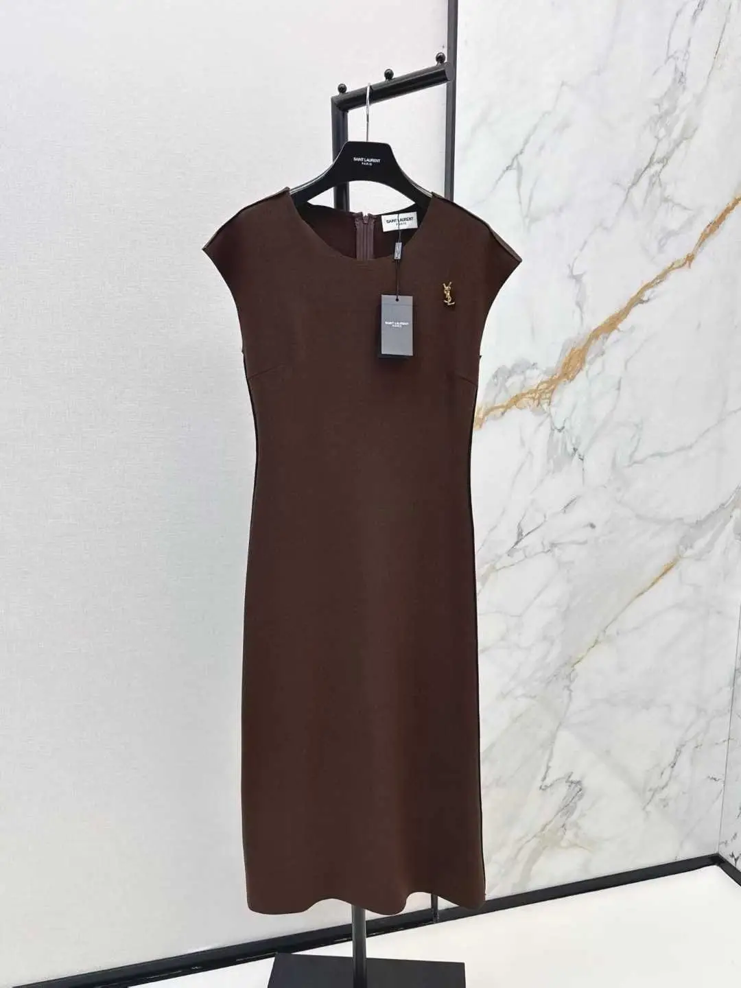 Finished with concealed precision stitching, a discreet back zip, and a subtle nod to the iconic YSL branding, this dress is the epitome of effortless sophistication. Whether for a pivotal evening event, an avant-garde gallery opening, or a luxurious dinner, it is not merely a garment—it is a definitive statement of power, elegance, and uncompromising style.